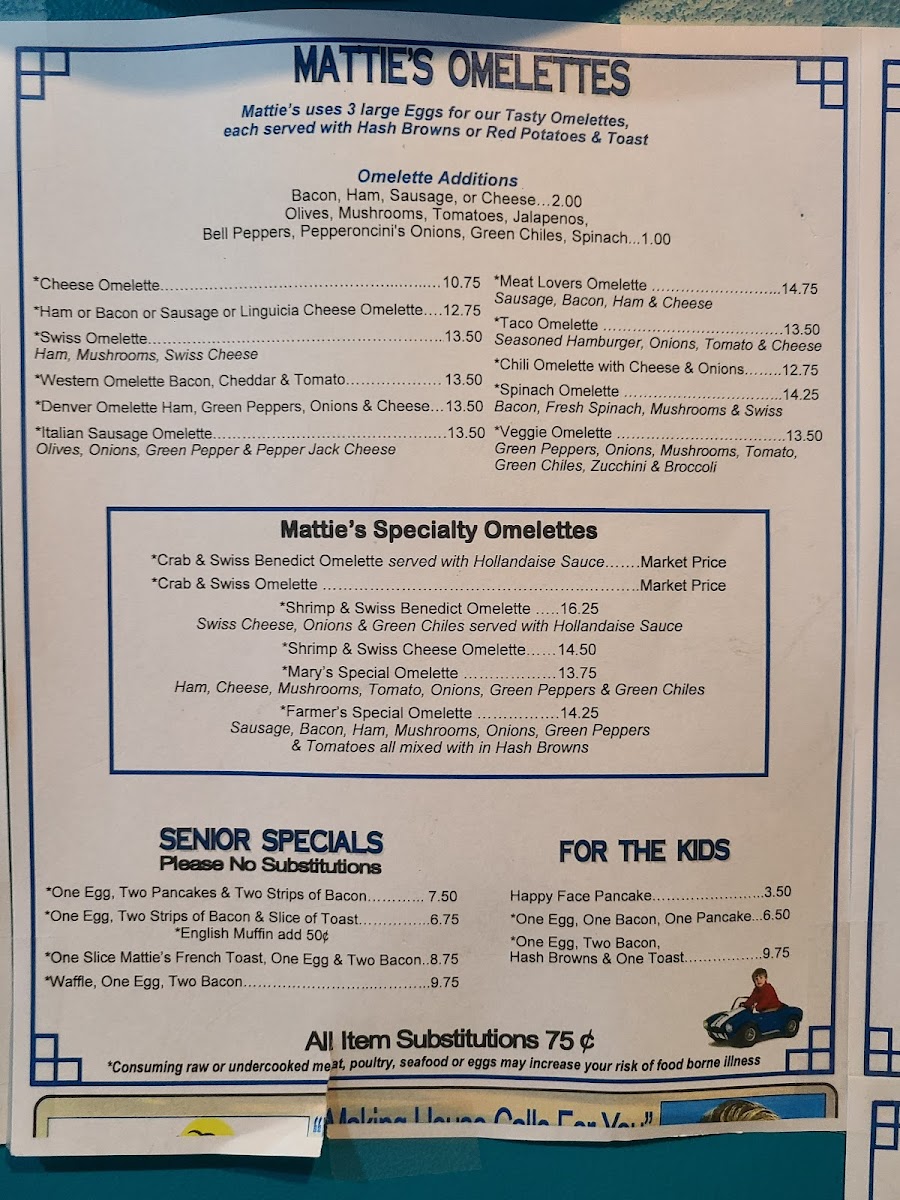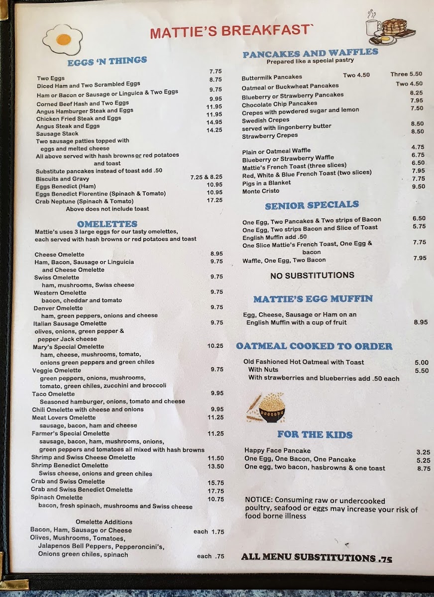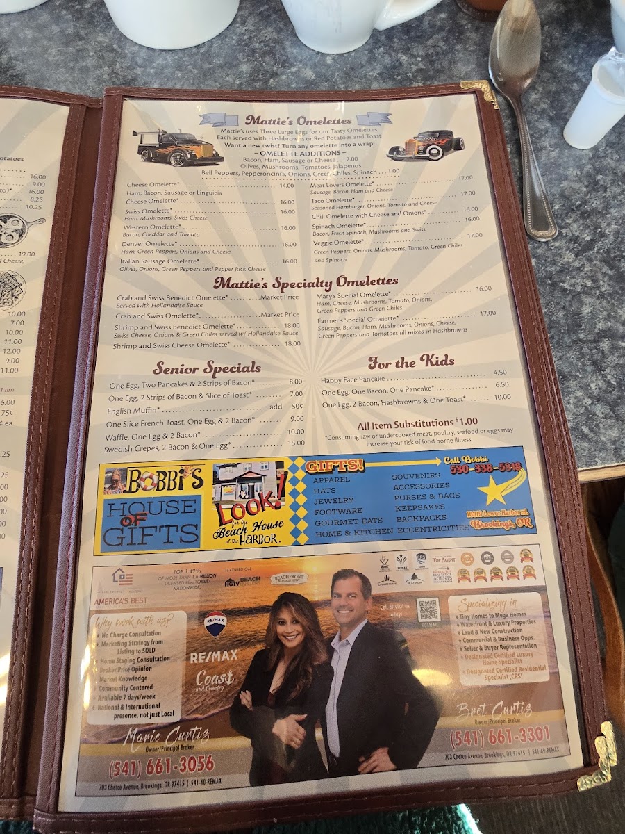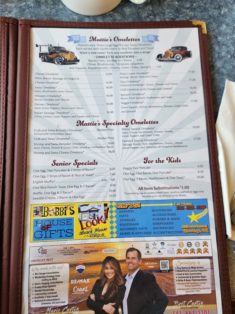 If you're ever in the mood for a cozy, welcoming spot to enjoy a hearty breakfast, look no further than Mattie's Pancake House. Located at 15975 US-101 in Brookings, OR, this charming restaurant offers a wide variety of delicious options that will satisfy any craving. The Mattie's Pancake House Menu is packed with all your favorite breakfast classics, from fluffy pancakes stacked high with your choice of toppings to crispy bacon and perfectly cooked eggs. Whether you're stopping in for a quick bite or looking to settle in for a leisurely meal, there's something here for everyone. They also have a range of omelets, French toast, and sides that pair perfectly with a cup of freshly brewed coffee. The warm and friendly atmosphere makes it the perfect place to enjoy a meal with family and friends. Each dish is made with care and packed with flavor, ensuring a memorable dining experience every time you visit.