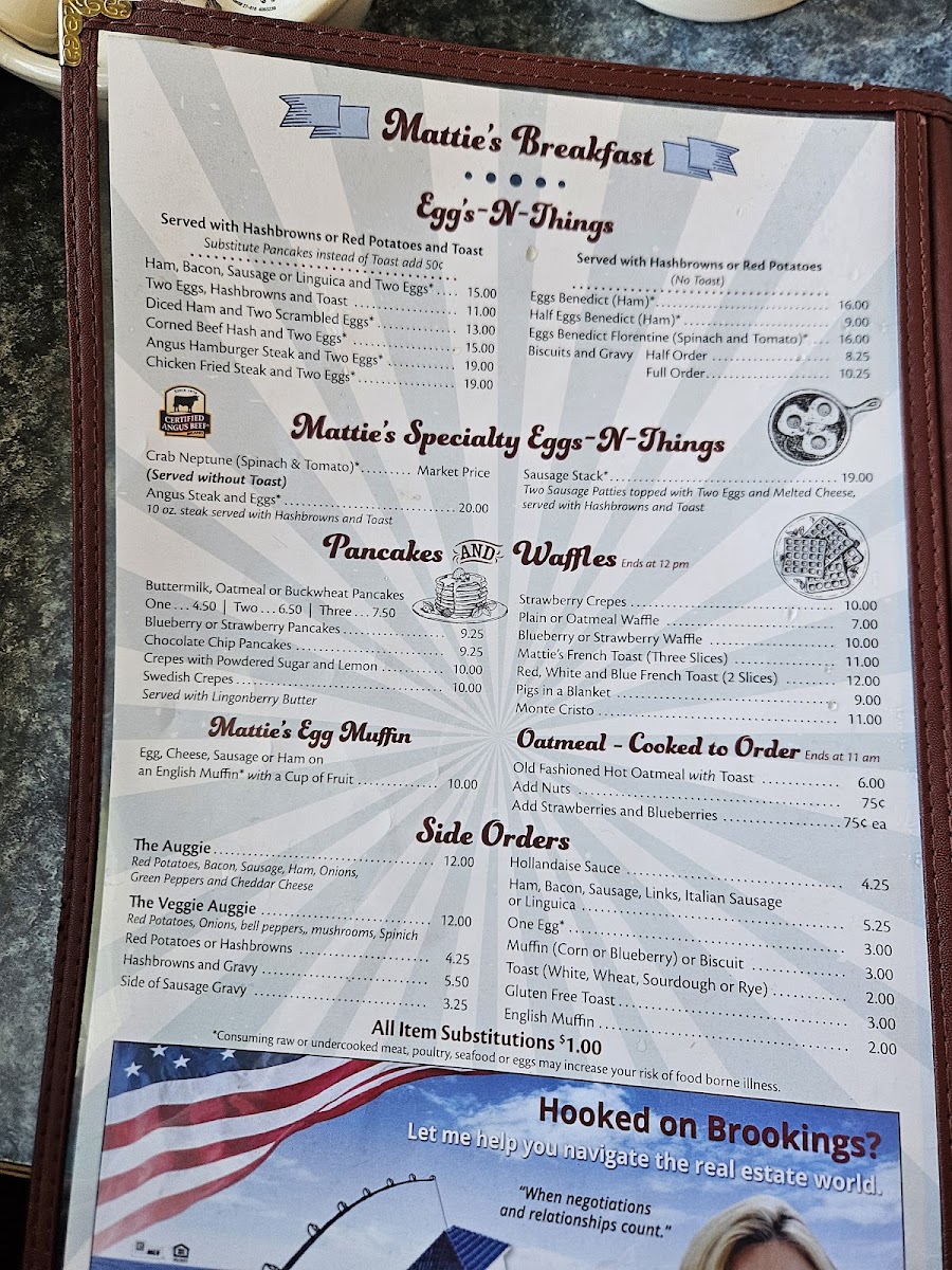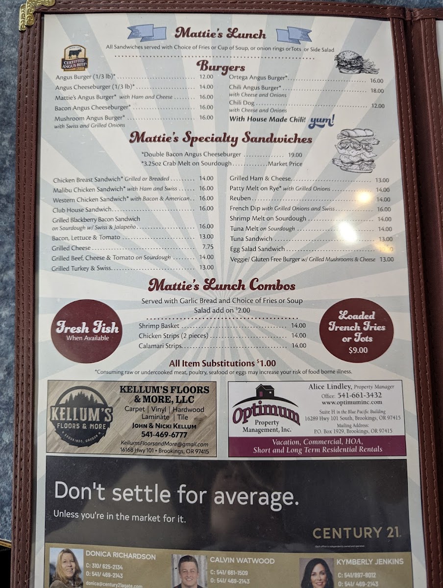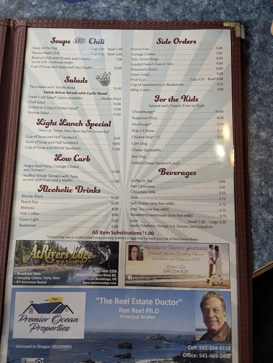 If you're ever in the mood for a cozy, welcoming spot to enjoy a hearty breakfast, look no further than Mattie's Pancake House. Located at 15975 US-101 in Brookings, OR, this charming restaurant offers a wide variety of delicious options that will satisfy any craving. The Mattie's Pancake House Menu is packed with all your favorite breakfast classics, from fluffy pancakes stacked high with your choice of toppings to crispy bacon and perfectly cooked eggs. Whether you're stopping in for a quick bite or looking to settle in for a leisurely meal, there's something here for everyone. They also have a range of omelets, French toast, and sides that pair perfectly with a cup of freshly brewed coffee. The warm and friendly atmosphere makes it the perfect place to enjoy a meal with family and friends. Each dish is made with care and packed with flavor, ensuring a memorable dining experience every time you visit.
